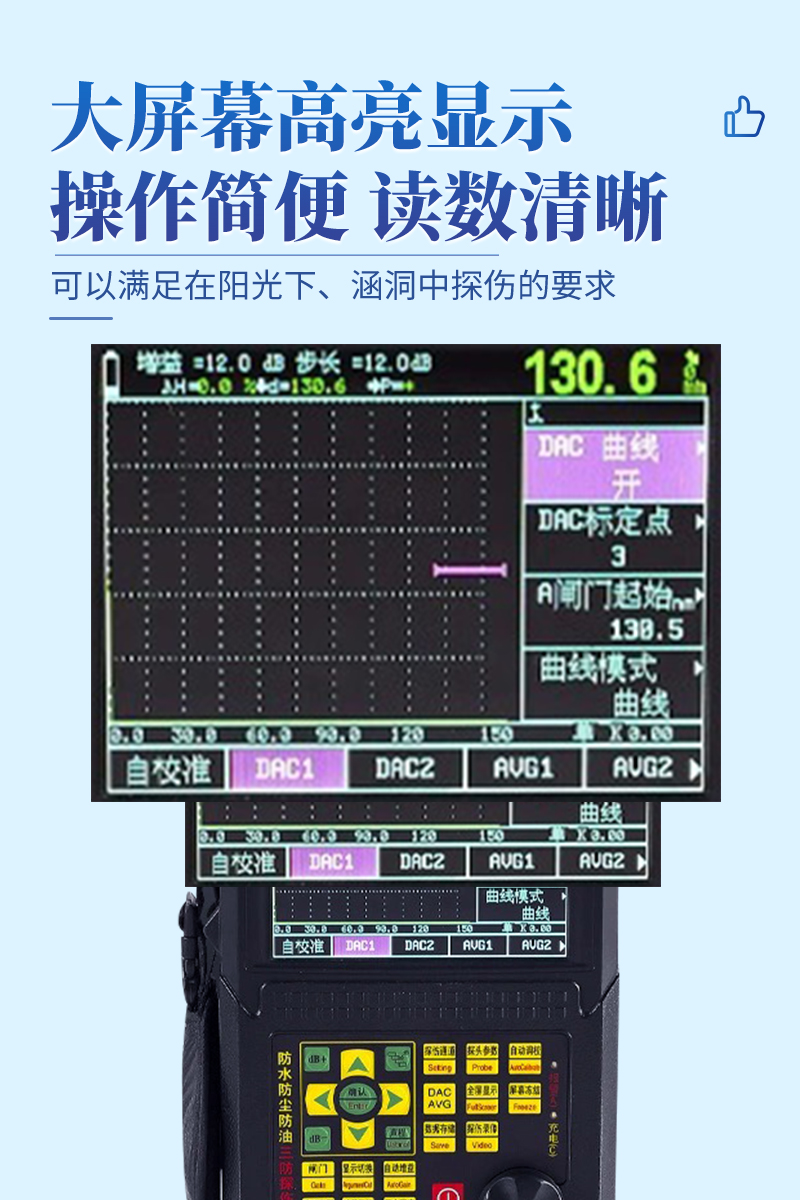 ● 大屏幕高亮顯示,可以適合在陽(yáng)光下、涵洞中探傷的要求;