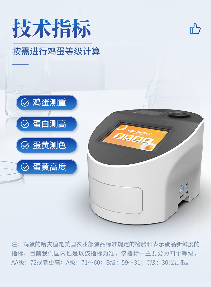 雞蛋品質(zhì)分析儀技術(shù)指標(biāo):雞蛋測重,蛋白測高,蛋黃測色,哈夫值顯示,蛋黃高度等,可進(jìn)行雞蛋等級計(jì)算。雞蛋的哈夫值是美國農(nóng)業(yè)部蛋品標(biāo)準(zhǔn)規(guī)定的檢驗(yàn)和表示蛋品新鮮度的指標(biāo),目前我們國內(nèi)也是以該指標(biāo)為準(zhǔn),該指標(biāo)中主要分為四個(gè)等級,AA級:72或者更高;A級:71~60;B級:59~31;C級:30或更低。