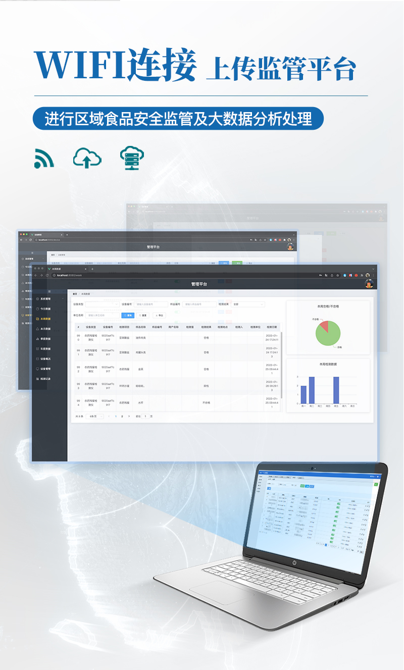 9.6、數(shù)據(jù)監(jiān)管系統(tǒng):同步對接監(jiān)管平臺,數(shù)據(jù)可局域網(wǎng)和互聯(lián)網(wǎng)數(shù)據(jù)上傳,檢測結(jié)果可選擇直接傳至食品安全監(jiān)管平臺。進(jìn)行區(qū)域食品安全監(jiān)管及大數(shù)據(jù)分析處理與數(shù)據(jù)統(tǒng)計,檢測區(qū)域食品安全長短期動態(tài),達(dá)到食品安全問題預(yù)估、預(yù)警。