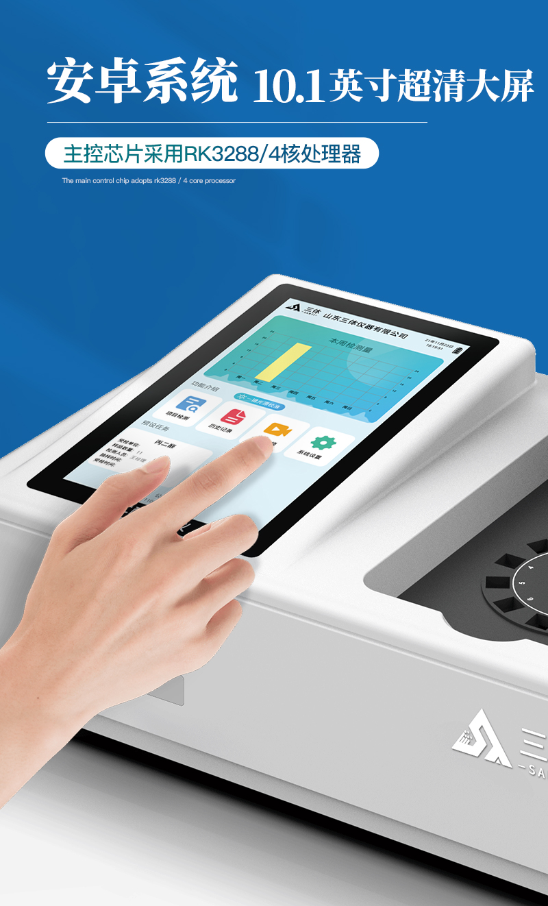 3、顯示屏幕:儀器采用10.1英寸豎向液晶觸摸屏顯,搭配運(yùn)行安卓智能操作系統(tǒng),主控芯片采用ARM Cortex-A7,RK3288/4核處理器,主頻1.88Ghz,操作方便,性能更強(qiáng)。