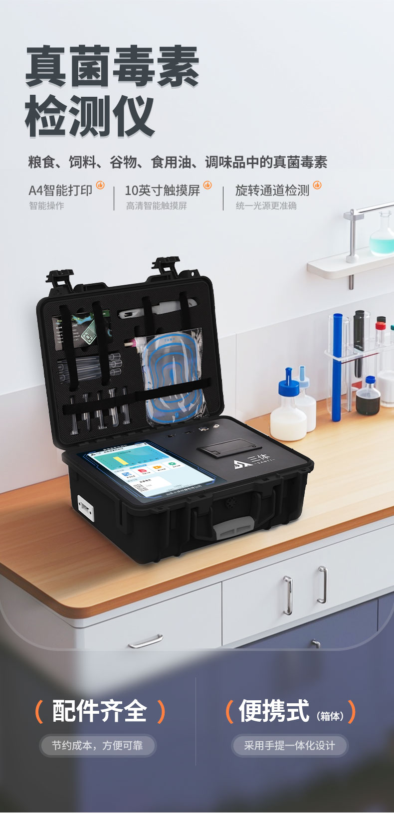 3、一體化便攜式快檢設(shè)備,采用交直流兩用供電方式,可連接車載電源,配備6ah大容量充電鋰電池,可以滿足現(xiàn)場及流動(dòng)檢測使用的需求。儀器尺寸:43×35×20cm, 主機(jī)凈重:5.1kg