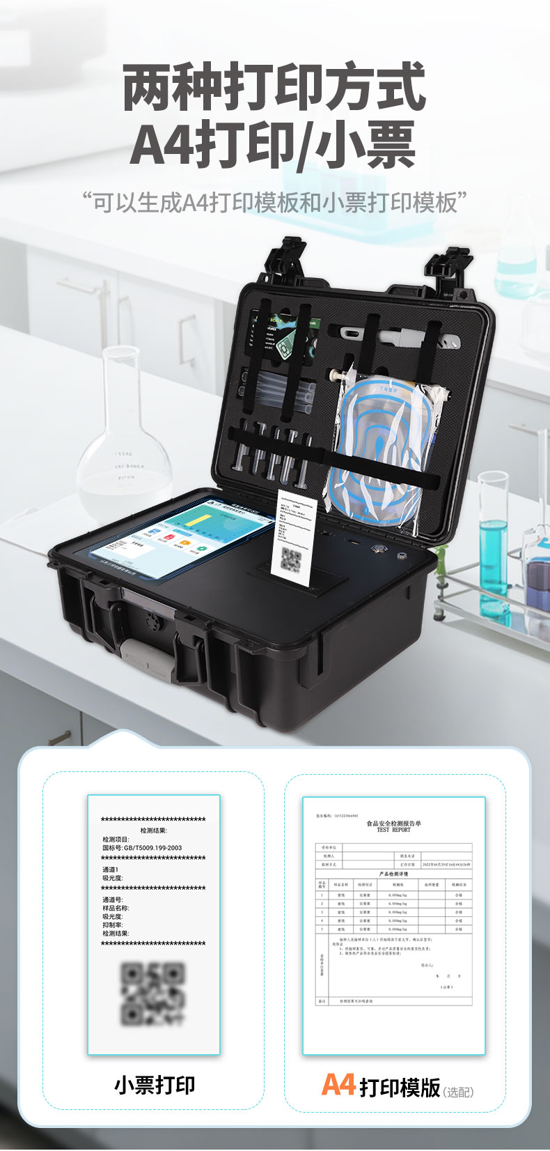 10、A4紙版本報(bào)告打印功能:設(shè)備擁有兩種結(jié)果展示方式,可以自動(dòng)生成A4打印模板和小票打印模板兩種樣式,可通過WiFi及網(wǎng)線等方式鏈接外置打印機(jī)可進(jìn)行打印